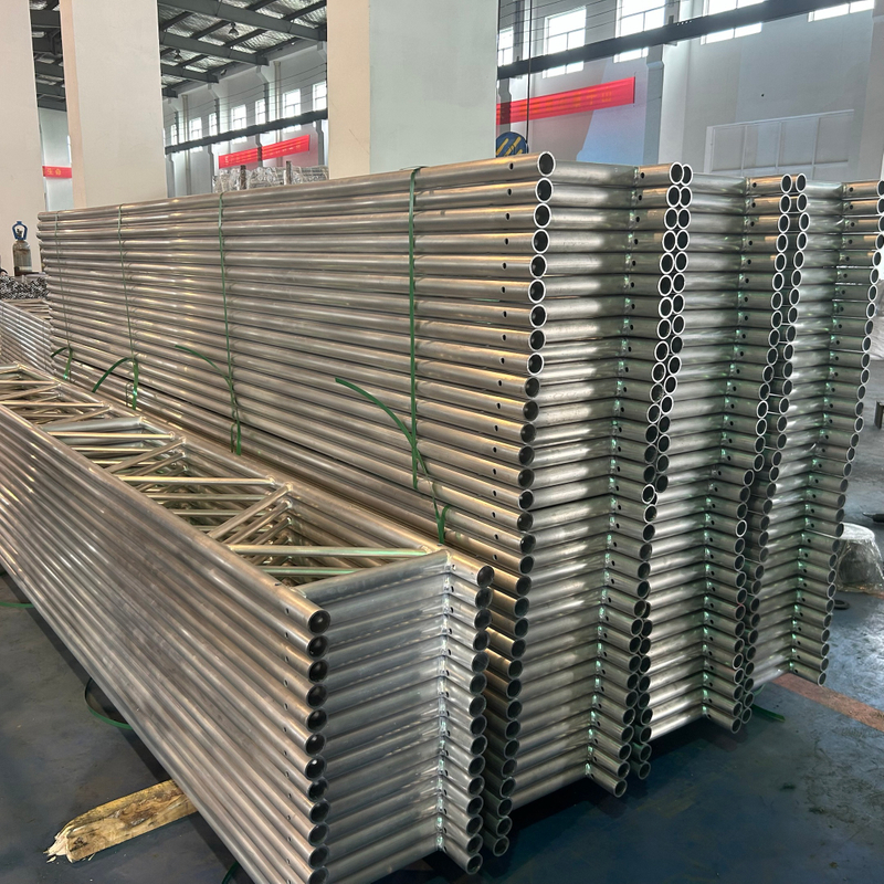 A viga treliçada de alumínio é feita de tubo de andaime de liga de alumínio na categoria 6061 T5 e o diâmetro do tubo de andaime é de 48,3 mm. A largura do feixe de alumínio pode ser de 300 mm, 305 mm, 400 mm e outras especificações a serem personalizadas.